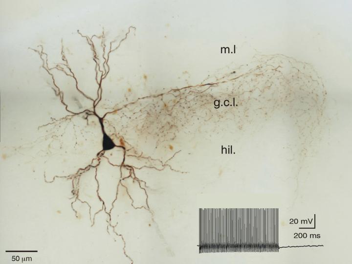 A fast-spiking soma-inhibiting interneuron, a “basket cell” with its characteristic dense axonal arbor in the granule cell layer (g.c.l.) of the dentate gyrus.